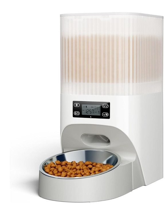 این دستگاه با ظرفیت ۴ لیتر، حدود ۴ کیلوگرم غذای خشک را نگهداری میکند و میتواند برای ۷ تا ۲۰ روز گربه یا سگهای کوچک را تغذیه کند. طراحی شفاف مخزن باعث میشود بدون باز کردن، مقدار غذای باقیمانده را ببینید.