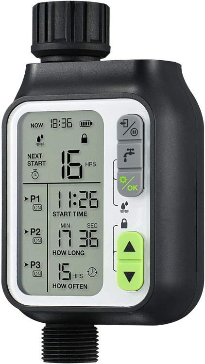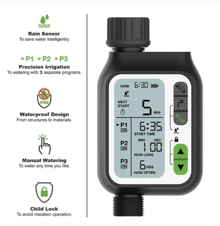 آبیاری خودکار و دستی: این تایمر به طور خودکار برنامه های آبیاری را با توجه به زمان شروع آبیاری، مدت زمان و دفعات تعیین شده توسط شما اجرا می کند. و امکان استفاده فوری از آبیاری را بدون وقفه در برنامه آبیاری برنامه ریزی شده شما فراهم می کند.