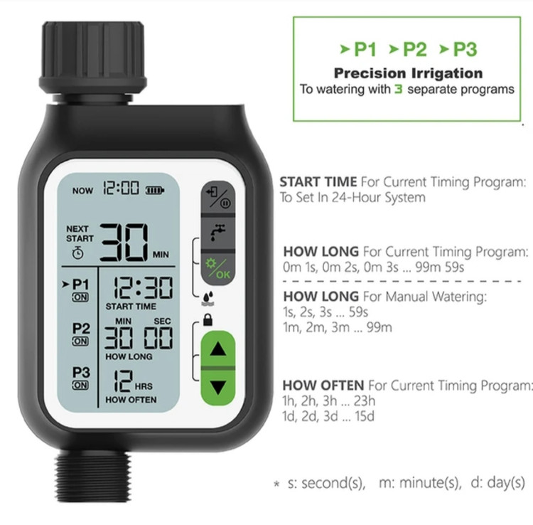 3 برنامه آبیاری قابل تنظیم: تایمر آبپاش دارای 3 برنامه جداگانه (P1/P2/P3) است، هر برنامه می تواند زمان شروع خود را (حالت 24 ساعته)، مدت زمان آبیاری (1-99m59 ثانیه) و آبیاری فرکانس (1h -15) تنظیم کند. روزها). این 3 تنظیمات برنامه تایمر برنامه آبیاری شما را برای مراحل و فصول مختلف رشد گیاه انعطاف پذیرتر می کند.