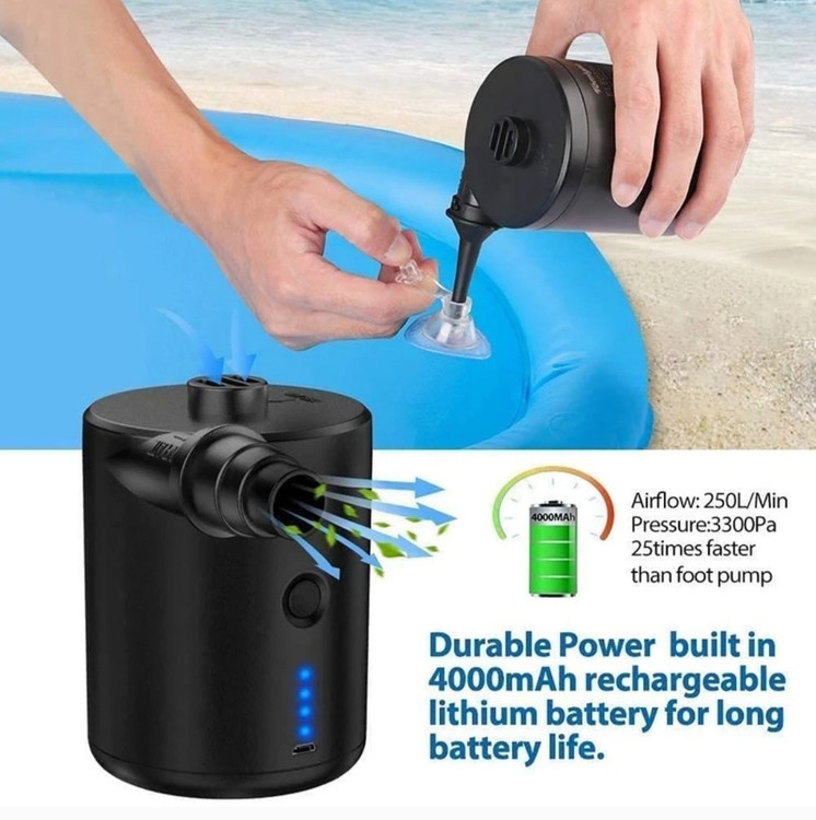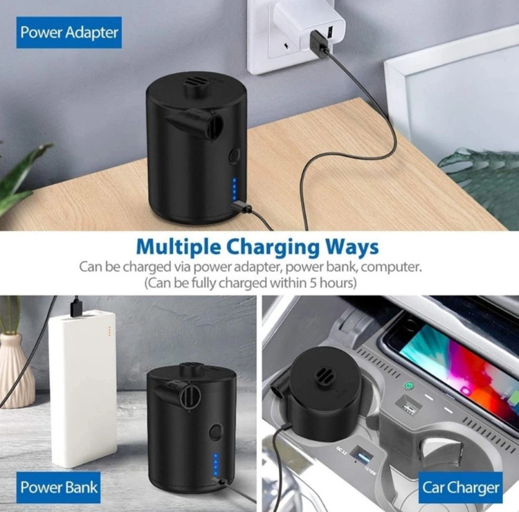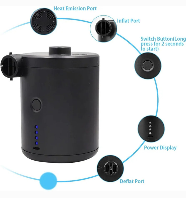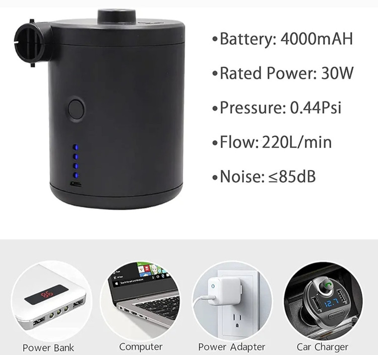 [پمپ باد برقی قابل شارژ] پمپ استخری دارای باتری قابل شارژ 4000 میلی آمپر ساعتی است، با رابط USB، بادکننده استخر بادی را می توان با اتصال به پریز برق، کامپیوتر، شارژر USB ماشین یا پاوربانک شارژ کرد. توجه: هنگام شارژ مطمئن شوید که ولتاژ رابط USB 5 ولت است.