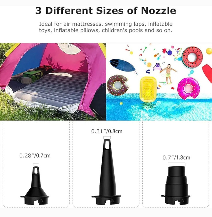 [3 اندازه مختلف نازل] پمپ برقی پارویی دارای 3 نازل با اندازه های مختلف است: S، M و L. نازل اندازه S مناسب برای محصولات کوچک بادی، مانند حلقه شنا، بالش بادی و غیره. نازل اندازه M مناسب است. برای تخت بادی، صندلی استخر بادی و غیره. نازل اندازه L مناسب برای تشک بادی و سایر محصولات بادی بزرگ.