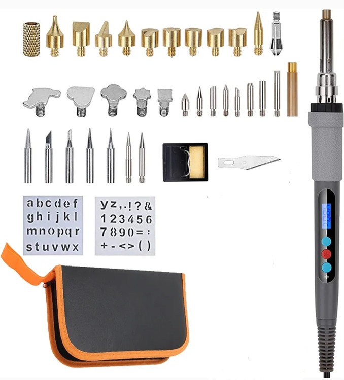 کیت ابزار چوب سوز ال سی دی با آهن لحیم کاری، کیت ابزار پیروگرافی قلم چوب سوز با نقش برجسته، کنده کاری، نوک لحیم کاری، کیف حمل