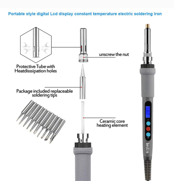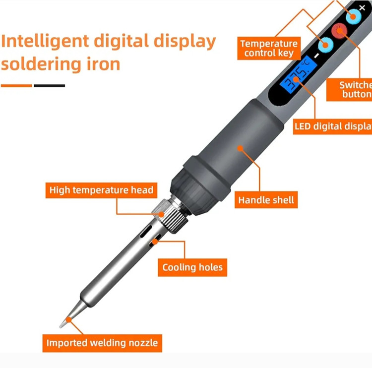 دمای قابل تنظیم: مدار کنترل سنسور دما، فناوری کنترل دمای میکرو کامپیوتر، با نمایشگر دقیق دما و جبران دما با سرعت بالا (دقت دما ± 5 درجه سانتیگراد). این یک آهن لحیم کاری با دمای ثابت سبک قابل حمل با نمایشگر دقیق است.