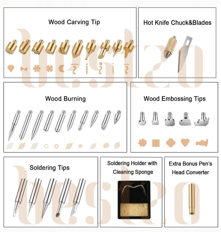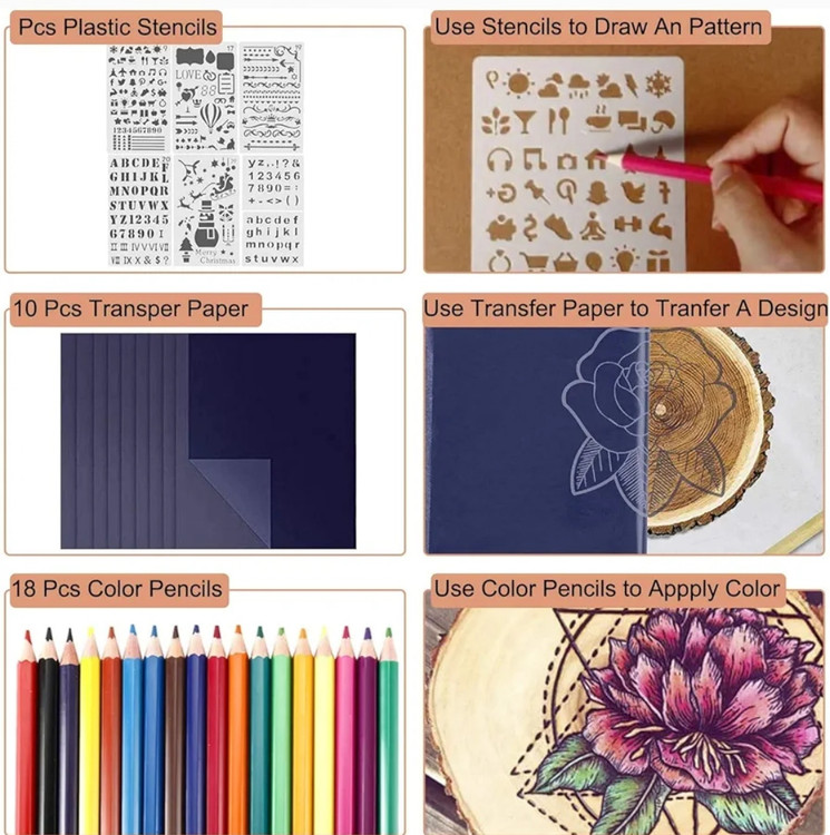 کیفیت با طراحی جذاب: موجود در رنگ های مختلف قرمز، خاکستری، نارنجی یا مشکی. این کیت چوب سوز را می توان به عنوان کیت چوب سوز، آهن لحیم کاری و برش چاقوی داغ با چندین نوک قابل تعویض استفاده کرد. می تواند روی چوب، چرم، کدو حلوایی کار کند. همچنین برای جوشکاری برد مدار، تعمیر لوازم خانگی کار می کند. پایه اصلی هنر چوب سوزی شما یک کیت خوب پیروگرافی است. «داشتن تمام ابزارهای مورد نیاز در دستان شما، تمرکز روی کار و خلاقیت را آسانتر میکند.