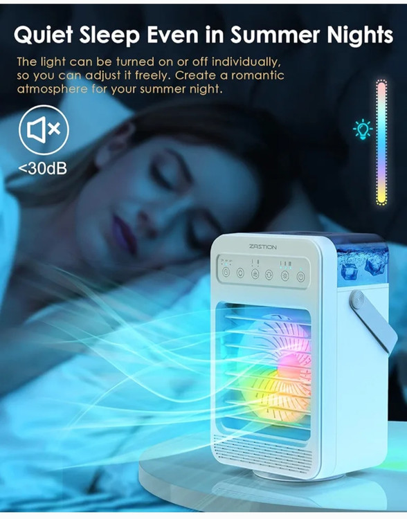 تهویه مطبوع مینی موبایل 5 در 1: مینی کولر گازی قابل حمل ZASTION ترکیبی از فن خنک کننده هوا، رطوبت ساز، فن یکپارچه و چراغ شب LED است. می توانید برای کولر گازی سیار یا روغن آروماتراپی آب اضافه کنید. طراحی قدرتمند 4 در 1 آن را برای محل کار، خواب، آرایش، اتاق خواب، اداره، خانه کاملاً مناسب می کند.