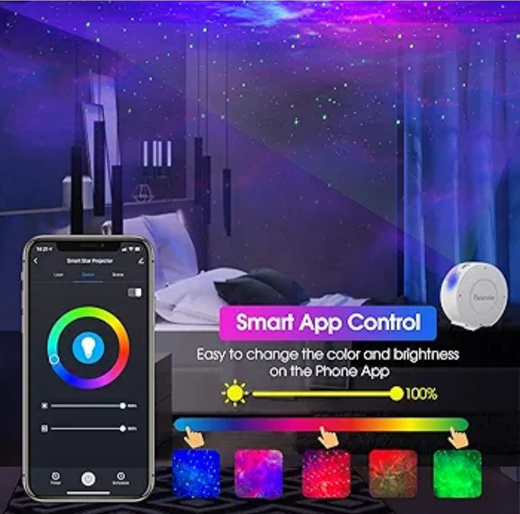 کنترل برنامه هوشمند: پروژکتور ستاره نه تنها می تواند به عنوان سنتی با یک دکمه استفاده شود، بلکه از کنترل برنامه هوشمند نیز پشتیبانی می کند، که با برنامه "Smart Life" کار می کند، می توانید پروژکتور ستاره ای را از راه دور برای تغییر رنگ، تنظیم روشنایی کنترل کنید و مستقیماً از طریق تلفن خود تایمر را تنظیم کنید، زندگی خود را هوشمندتر و رنگارنگ تر کنید. (نکته: فقط شبکه WiFi 2.4 گیگاهرتز)