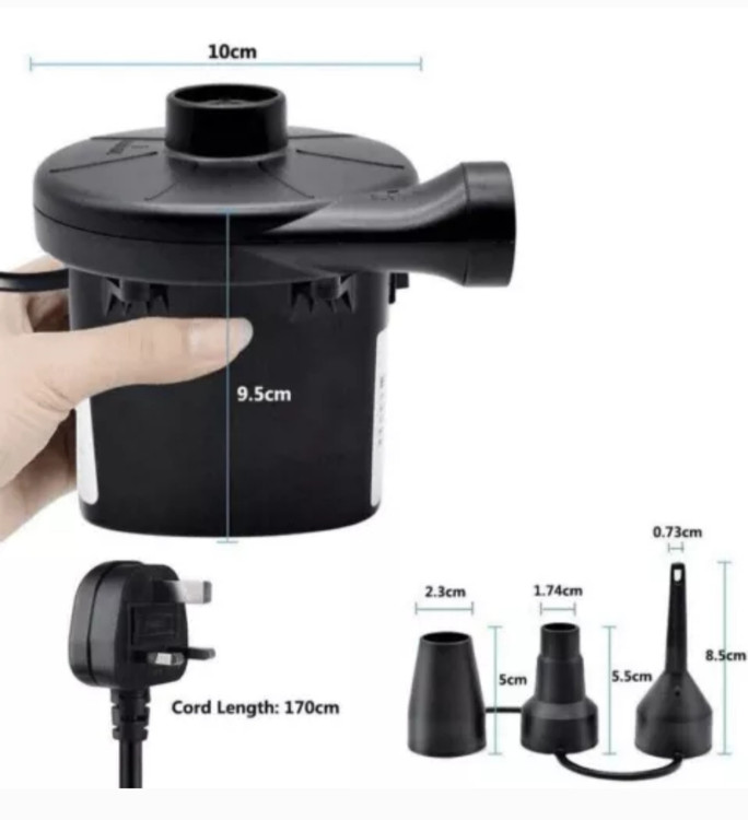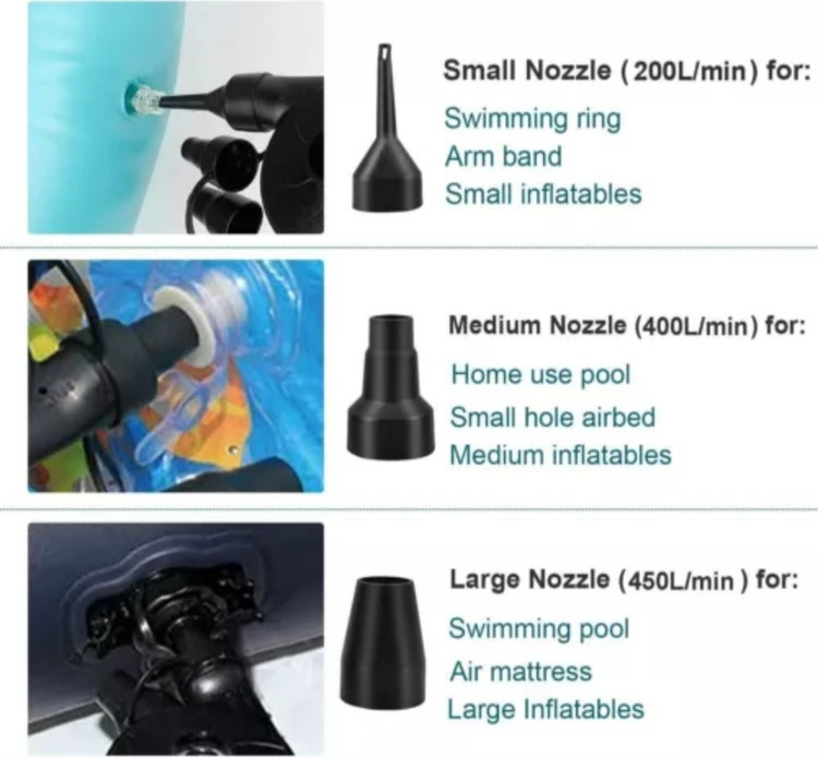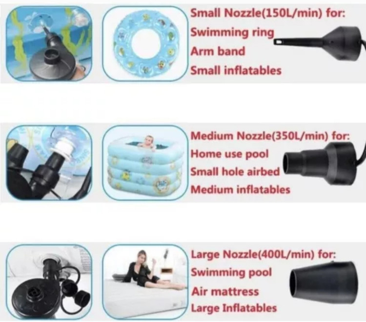 3 نازل برای انتخاب 3 نازل برای انتخاب: این الکتروپمپ با 3 نازل برای انتخاب شما، می تواند برای اکثر وسایل بادی که برای باد کردن یا تخلیه باد نیاز دارید، مناسب باشد. چند کاربرد بادکننده سریع هوای ما برای انواع مختلف محصولات هوادهی مانند تخت بادی، مبل بادی، اسباب بازی های پر از هوا، استخر بادی و حلقه های شنا و غیره مناسب است.