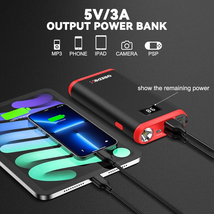 【جهش استارتر قدرتمند خودرو】 استارت پرش قابل حمل GREPRO قادر است بسیاری از وسایل نقلیه 12 ولتی (تا 6.0 لیتر بنزین / 3.0 لیتر دیزل) را تا چند برابر با شارژ کامل راه اندازی کند، برای خودروهای سواری، موتور سیکلت، ماشین چمن زنی کار می کند. ، تریلر، ماشین های برفی و غیره. هر راننده باید در مواقع اضطراری یک پرش باطری ماشین داشته باشد.