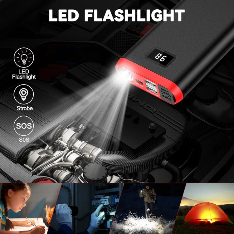 【صفحه نمایش ال سی دی و چراغ قوه LED روشن】پرش استارت تقویت کننده باتری خودرو صفحه نمایش ال سی دی جدید اضافه شده می تواند دقیقا قدرت باقی مانده و چراغ قوه LED داخلی را با سه حالت (روشن، بارق و SOS) نشان دهد. این چراغ قوه LED فوقالعاده میتواند در هر بار شارژ کامل دوام زیادی داشته باشد. در هر صورت می تواند به شما کمک کند مخصوصاً برای کمپینگ، ماجراجویی، فضای باز، روزانه، اضطراری، مسافرت