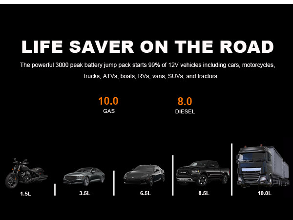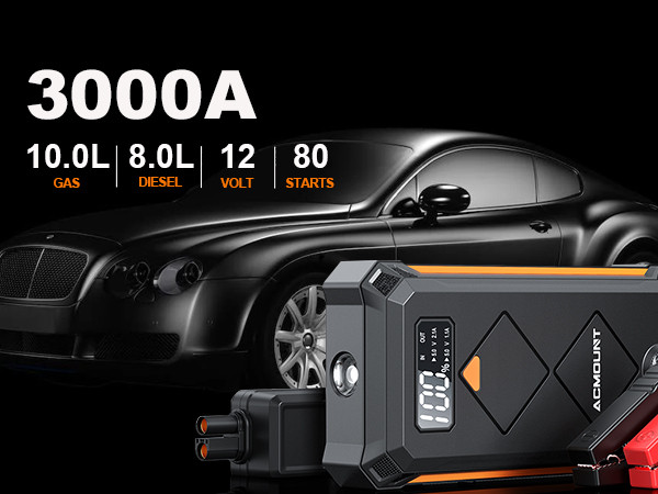 3000A Jump Starter, [Start Everything in Seconds] 12V Portable Compact Battery Pack Jump Starter Up to 10.0L Gas & 8.0L Diesel Engine for Car with LCD & LED Light