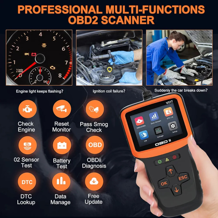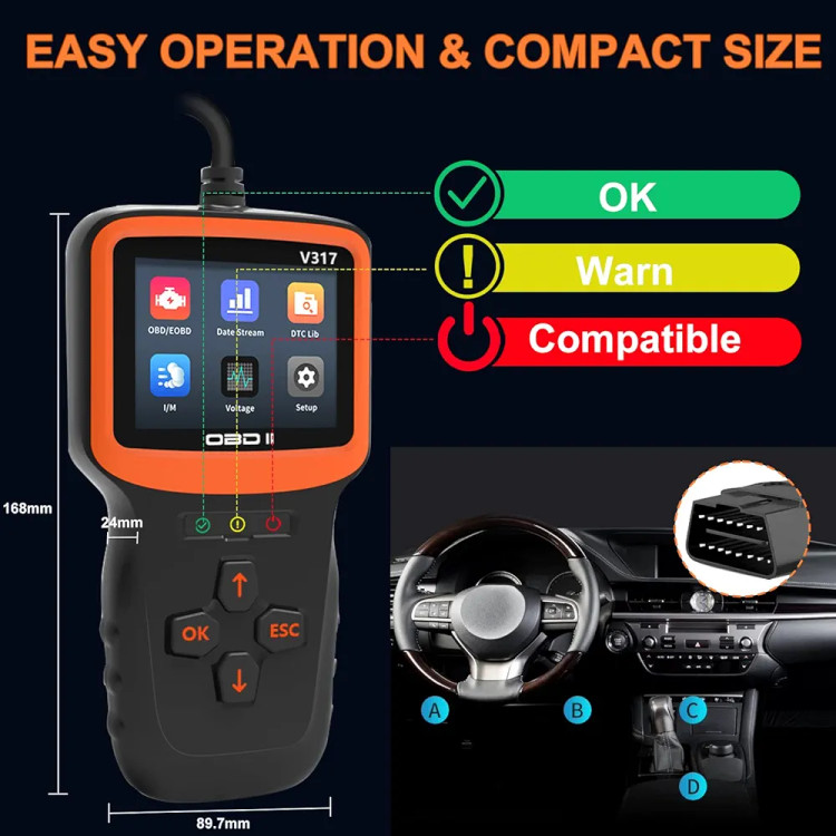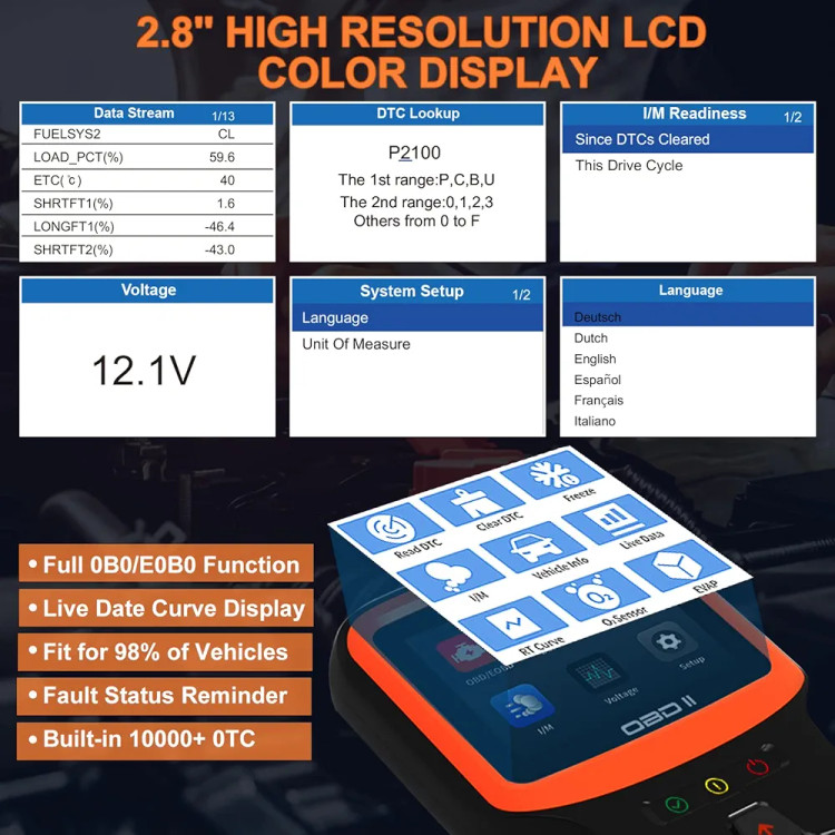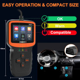 سازگاری گسترده و چندین زبان ابزار تشخیصی اسکنر OBD2 روی همه مدلهای خودروهای پس از سال 1996 و جدیدتر در ایالات متحده آمریکا (OBD II&CAN) یا سایر خودروهای وارداتی کار میکند. از جمله خودروهای سازگار، کامیونهای سبک، دیزل 12 ولت، SUV، مینیون، هیبریدی، گاری گلف، موتور سیکلت، ماشین چمنزنی و وانت. پشتیبانی از 8 زبان: انگلیسی، فرانسوی، اسپانیایی، آلمانی، روسی، ایتالیایی، هلندی، چینی که استفاده از آن را برای مردم کشورهای مختلف آسان می کند.