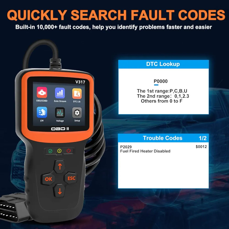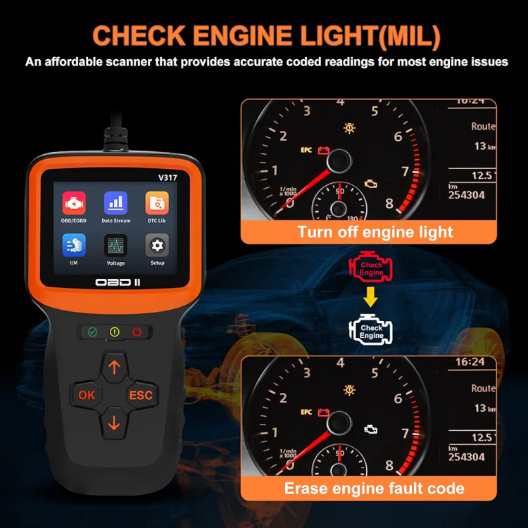 ابزار چک کردن حرفهای موتور خودرو اسکنر پیشرفته OBDII میتواند کدهای مشکلی را که میتواند باعث مشکلات ارسال الکترونیکی در خودروی شما شود در چند ثانیه بخواند و پاک کند، چراغ موتور را بررسی کنید (موتور ماشین خود را بررسی کنید) و مانیتور را بازنشانی کند، یک جستجوی DTC ایجاد کند. در کتابخانه می توانید تعاریف کد مرتبط را بیابید تا به شما کمک کند تعیین کنید که آیا ماشین شما نیاز به تعمیر دارد یا خیر، در وقت و هزینه شما صرفه جویی می کند و طول عمر/عملکرد ماشین شما را به طور چشمگیری بهبود می بخشد.
