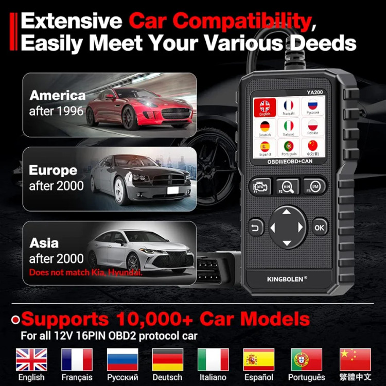 اسکنر OBD2 KINGBOLEN YA200، چراغ چک موتور کد خوان OBD2 خودرو، ابزار تشخیص اسکنر خودرو برای همه خودروهای پروتکل OBDII CAN از سال 1996
