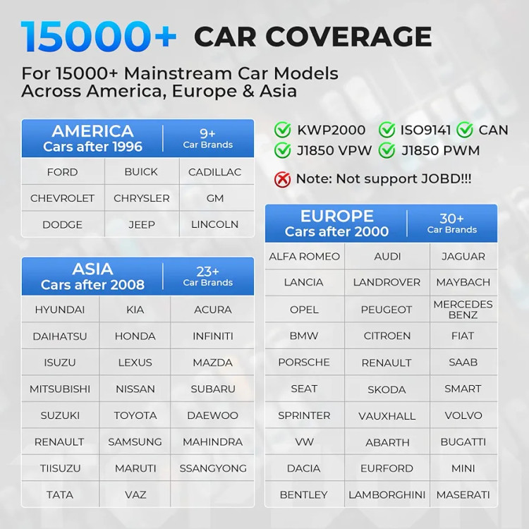 برای اکثر خودروها: کد خوان جهانی خطای خودرو Topdon AL300 روی خودروهایی که از سال 1996 در ایالات متحده آمریکا و از سال 2000 در اروپا تولید می شوند و همچنین خودروهای تولید شده در آسیا کار می کند. از تمامی پروتکل های OBDII از جمله ISO9141، KWP2000، J1850 PWM، J1850 VPW و CAN پشتیبانی می کند. پشتیبانی از 7 زبان: انگلیسی، فرانسوی، آلمانی، اسپانیایی، پرتغالی، ایتالیایی، روسی.