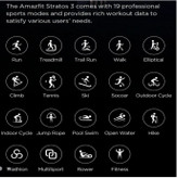 آمازفیت استراتوس 3 یک ساعت ورزشی حرفهای است که طبیعتا امکانات گستردهای را در این بخش در اختیار کاربران قرار میدهد. این ساعت هوشمند از 19 حالت ورزشی اختصاصی برخوردار است که با جمعآوری اطلاعات در هر کدام از این حالتها، عملکرد ورزشی و آمادگی جسمانی کاربر مورد ارزیابی قرار گرفته و در صورت نیاز پیشنهاداتی ارائه میشود.
