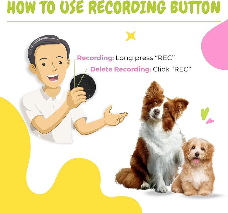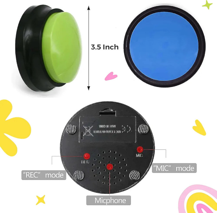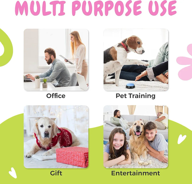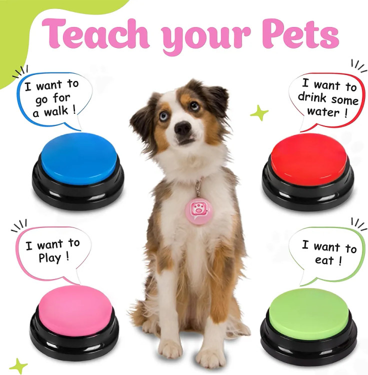زنگ آموزش حیوانات خانگی: - دکمه های ارتباطی حیوانات خانگی ممکن است عباراتی مانند "راه رفتن" "آب" "بازی" "تغذیه" و دیگران را ضبط کنند و دکمه های مختلف می توانند به عنوان جایگزین برای روش های آموزشی مختلف عمل کنند. به شما این امکان را می دهد که به حیوان خانگی خود آموزش دهید که دکمه مناسب را برای انجام کار مربوطه فشار دهد.