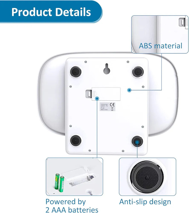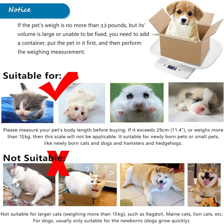 محدوده مقیاس: 1 گرم تا 15 کیلوگرم (0.01-33 پوند)، حداقل درجه 1 گرم. واحد: گرم / میلی لیتر / اونس / پوند. وقتی به عنوان ترازو حیوان خانگی استفاده می شود. این برای وزن کردن حیوانات خانگی کوچک مانند بچه گربه های کوچک، توله سگ ها، طوطی ها، همسترها، سنجاب ها، عنکبوت ها، مارمولک ها، خرگوش ها و سایر حیوانات کوچک است.