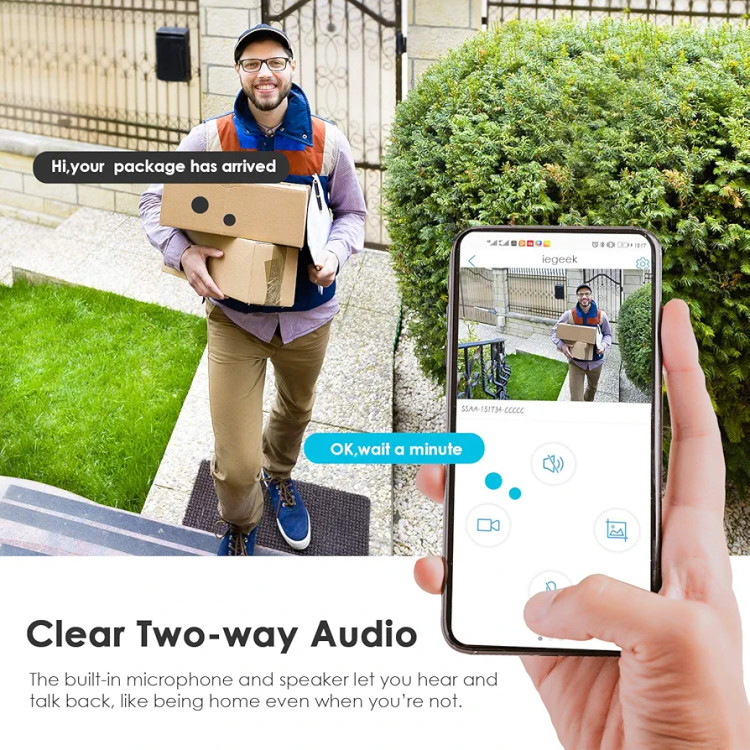 🎤【𝗖𝗹𝗲𝗮𝗿 𝟮-𝘄𝗮𝘆 𝗔𝘂𝗱𝗶𝗼& 𝗻】دوربین وای فای با میکروفون داخلی و اسپیکر ویدیوی ضبط شده را با صدای واضح می سازد. از طریق عملکرد اینترکام برنامه تلفن همراه، میتوانید با فردی که جلوی دوربین در فضای باز قرار دارد، در هر مکانی بیسیم صحبت کنید. دوربین از تشخیص صدا و اعلان تشخیص صدا در زمان واقعی پشتیبانی می کند. هر جا که هستید صدای مشکوک را بگیرید.