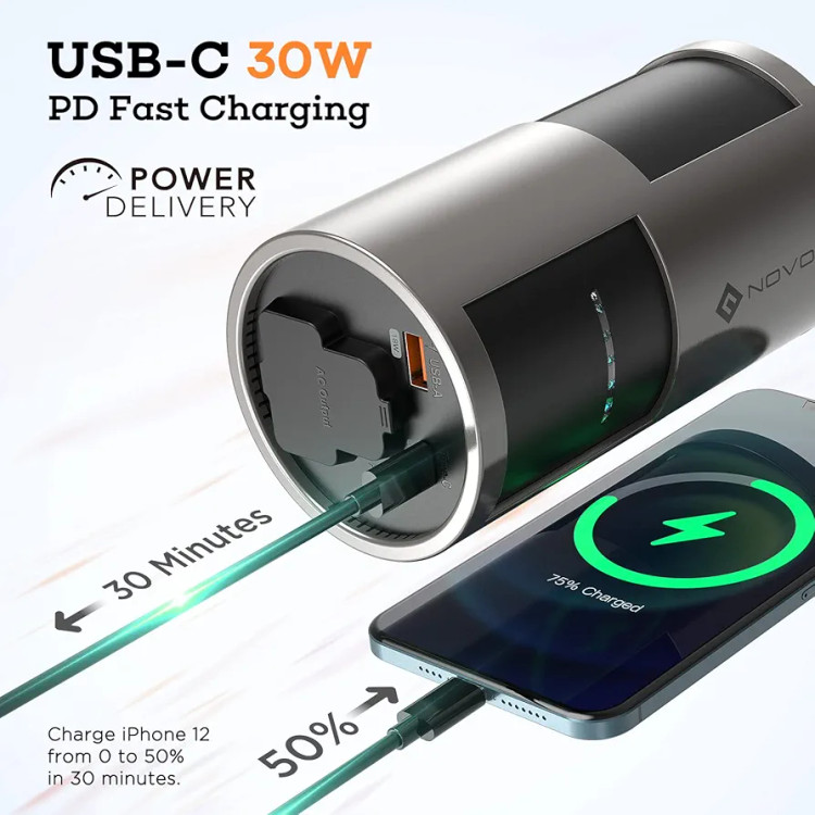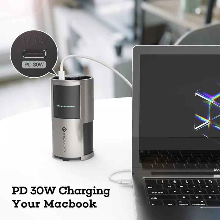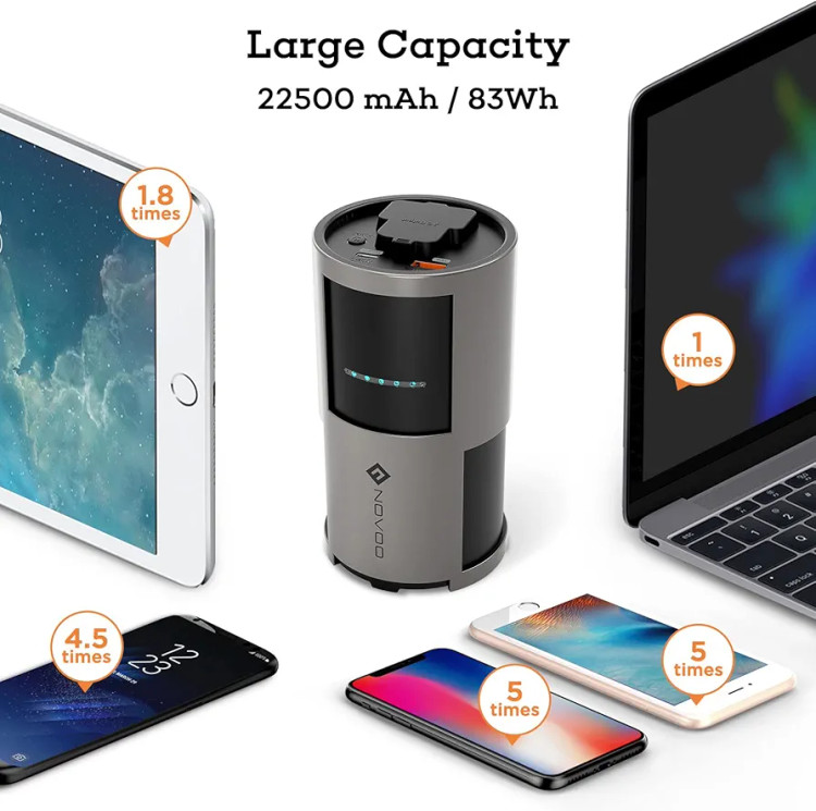 پریز برق AC قدرتمند: پاوربانک NOVOO با خروجی ac برای دوشاخه های معمولی بریتانیایی راه حلی ایده آل برای شارژ مجدد لوازم الکتریکی شما (مانند لپ تاپ، مک بوک، GoPros، لامپ ها، پهپادها، فن های کوچک) در هر زمان و هر مکان است. با ظرفیت 22500 میلی آمپر ساعت و توان حداکثر 83 وات ساعت، به اندازه کافی قوی است که دستگاه های شما را به طور انعطاف پذیر با مقدار مناسب برق تغذیه کند.