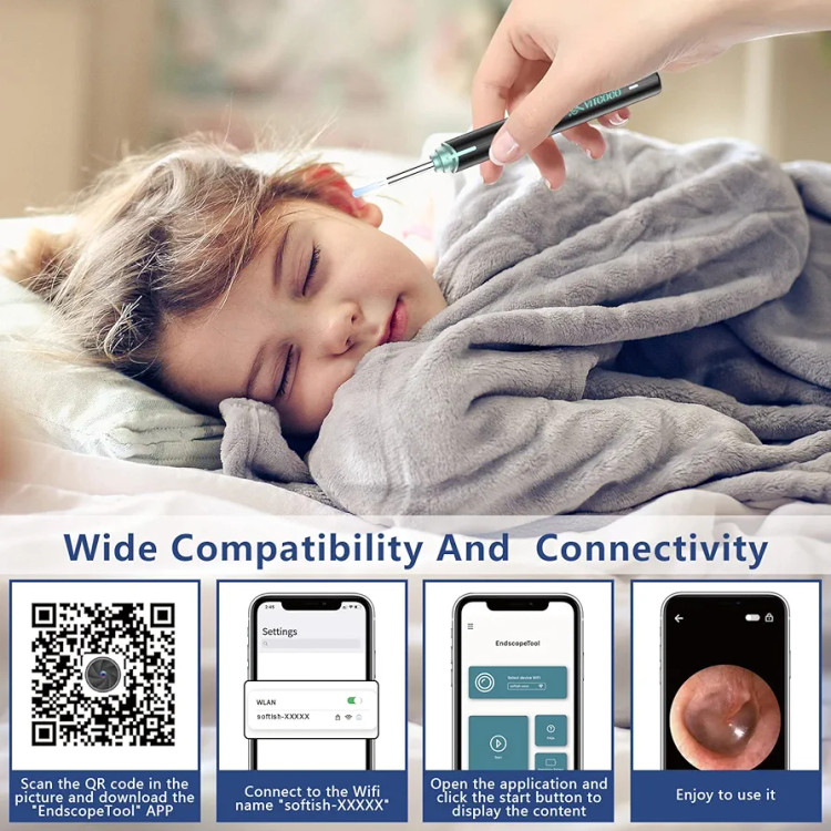 【کیت پاک کردن جرم گوش】گوش پاک کن هوشمند ما با ۴ نوع مختلف کیت گوش پاک کن تمیز کننده جرم گوش به صورت رایگان ارائه میشود، پیمانه جرم گوش از سیلیکون با کیفیت بالا ساخته شده و نسبتاً نرم است و یک پوشش اتوسکوپ وجود دارد تا بتوانید آن را در کیف خود هنگام بیرون رفتن نگه دارید که هم راحت و هم بهداشتی است. گوش پاک کن ما همچنین در یک جعبه زیبا عرضه میشود، بنابراین میتوانید آنها را به عنوان هدایای متفکرانه به خانواده یا دوستان در روزهای تولد یا روز شکرگزاری یا کریسمس نیز هدیه دهید. 【استفاده آسان】 این پاککننده جرم گوش با دوربین، سازگاری و اتصال گستردهای دارد. این پاککننده جرم گوش با اندروید، iOS و آیپد سازگار است. دوربین آندوسکوپی گوش وایفای اتوسکوپ را میتوان به راحتی در ۴ مرحله راهاندازی کرد: ۱. میتوانید کد QR موجود در دفترچه راهنما را اسکن کنید تا برنامه "Endscopetool" را دانلود کنید، ۲. اتوسکوپ و وایفای تلفن همراه را روشن کنید، ۳. به وایفای "Softish-XXXXX" متصل شوید، ۴. برنامه را باز کنید و برای گرفتن تصویر واضح، روی "شروع" کلیک کنید.