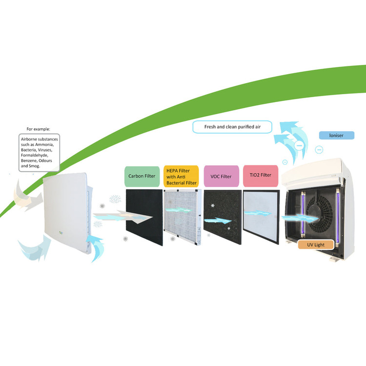 VOC Filterr - (ترکیبات آلی فرار) این فیلتر مولکول های مبتنی بر کربن را که 1000 برابر بیشتر در یک خانه متمرکز شده اند به دام می اندازد. زیرا هنگام استفاده از پاک کننده های خانگی، رنگ، چسب و فرش معرفی می شود. به عنوان مثال: فرمالدئید (محصولات خانگی) پلی اورتان (درزگیرها، رنگ فرش)