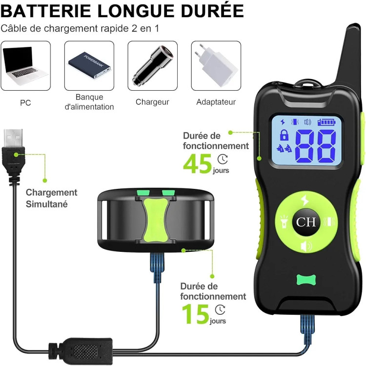 شارژ سریع و باتری طولانی مدت: ما به یک کابل شارژ USB یک به دو مجهز شده ایم که می تواند گیرنده و کنترل از راه دور را همزمان شارژ کند و می تواند در عرض 2-3 ساعت به طور کامل شارژ شود. برای آموزش سگ عمر باتری خوبی دارد، قلاده آموزشی قابل شارژ با ریموت تا 7-15 روز دوام می آورد.