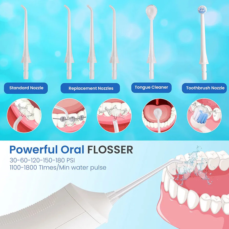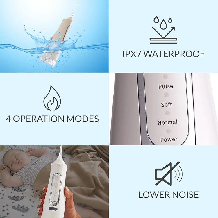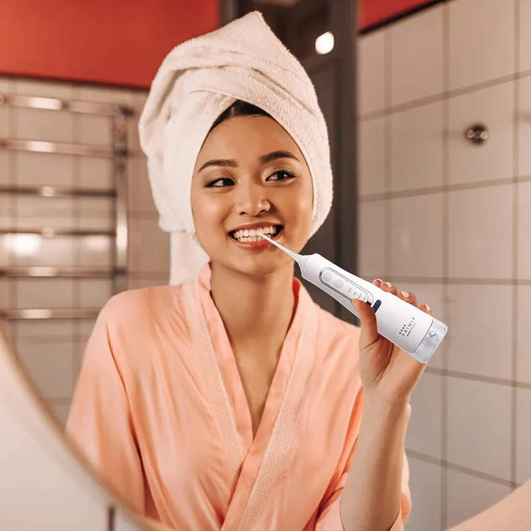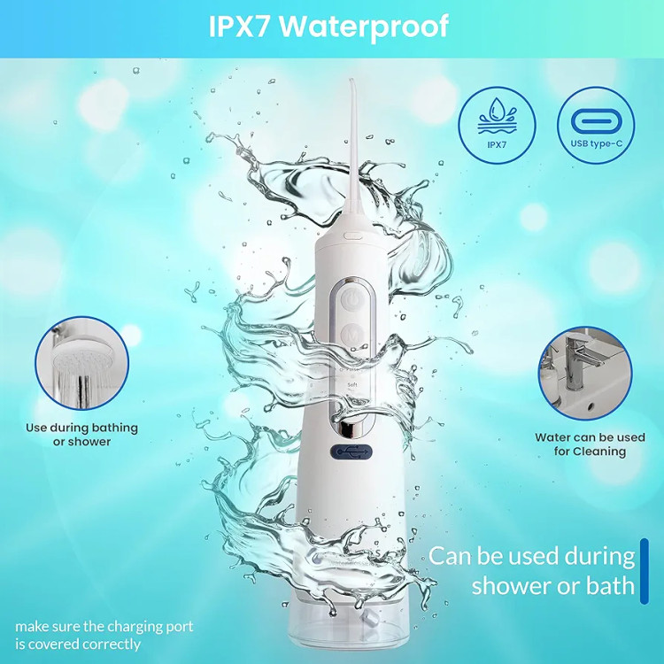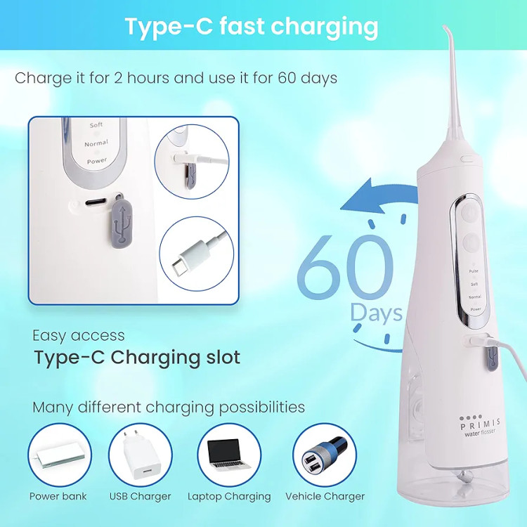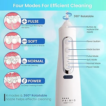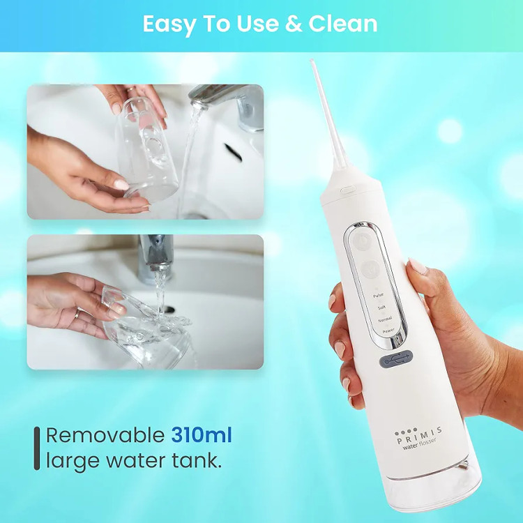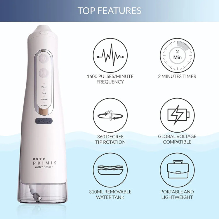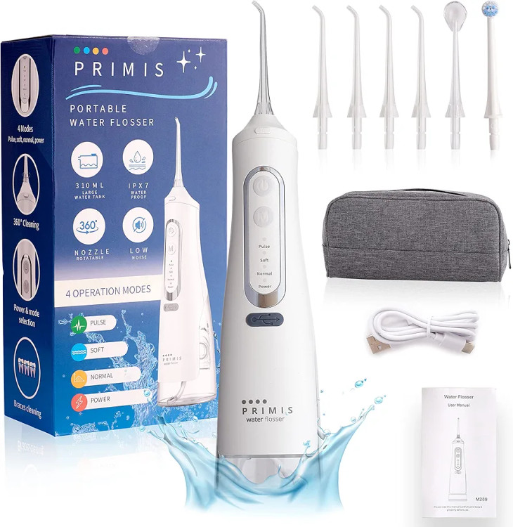 PRIMIS Water Shower for Teeth, Cordless IPX7 Waterproof with 4 Modes, Large 310ml Tank and 6 Jet Tips, USB Rechargeable Oral Irrigator for Travel and Home, Plaque Remover for Teeth (White)