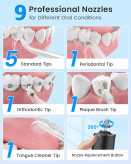 9 نازل و 5 حالت، گزینه های تمیز کردن همه کاره: مجهز به 9 نازل در رنگ های مختلف و با 5 حالت فشار از ملایم تا قدرتمند، انتخاب دندانپزشکی آب ما مراقبت جامع از دهان را برای کل خانواده تضمین می کند. طراحی چرخشی 360 درجه به طور موثر مناطقی را که دسترسی به آن ها سخت است تمیز می کند و از مشکلاتی مانند پوسیدگی، تارتار، خونریزی لثه و حساسیت دندان جلوگیری می کند. یک هدیه فوق العاده برای تولد، کریسمس، روز شکرگزاری یا مراقبت از سلامت دهان و دندان یکی از عزیزان