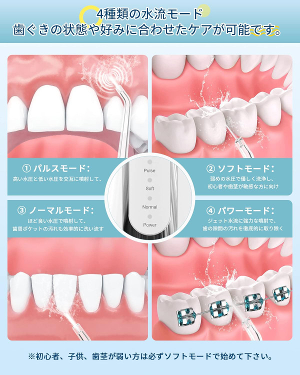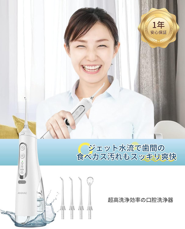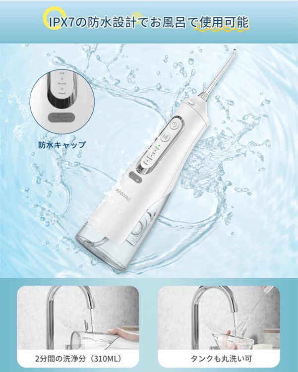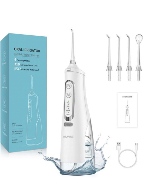 ANWAE Oral Washer, Jet Washer, 4 Replacement Nozzles, 4 Different Water Flow Modes, 11.2 fl oz 310 ml Tank, USB Rechargeable, IPX7 Waterproof, Oral Cleaning Equipment, White