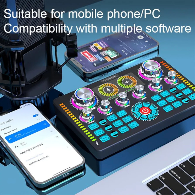 【پخش زنده چندگانه】حالتهای آن با موقعیتهای مختلف مطابقت دارد. برای حرفهایتر کردن شما در پخش. سوئیچ یک دکمه، ساده و سریع. همراهی سازگار با بلوتوث بیسیم، بدون محدودیت، سازگار با بلوتوث بهطور خودکار پس از راهاندازی روشن میشود. بلوتوث سازگار گوشی را روشن کنید تا Q7 را پیدا کنید و روی Match کلیک کنید.