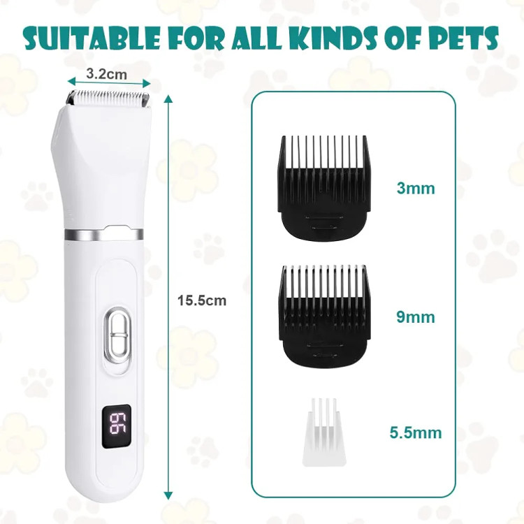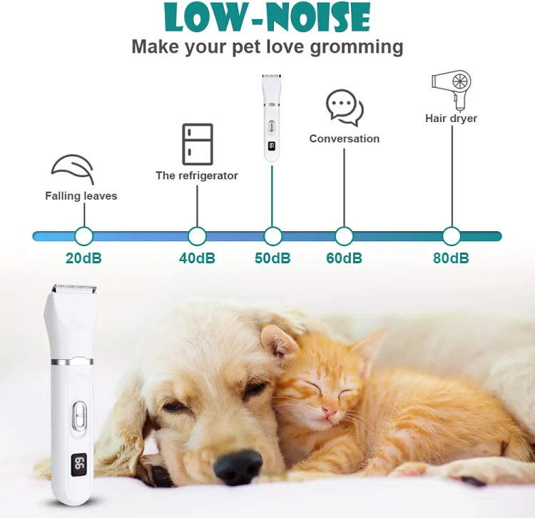 【موتور فوق العاده بی صدا】 کیت نظافت سگ دارای یک موتور بسیار آرام داخلی است که صدای زیادی تولید نمی کند و می تواند تجربه کوتاه کردن موی راحت و دلپذیری را برای حیوانات خانگی فراهم کند. طراحی کم لرزش و بی صدا از ترساندن حیوانات خانگی جلوگیری می کند، مقاومت در برابر کوتاه کردن مو را کاهش می دهد و باعث می شود حیوانات خانگی دیگر از مدل مو نترسند.