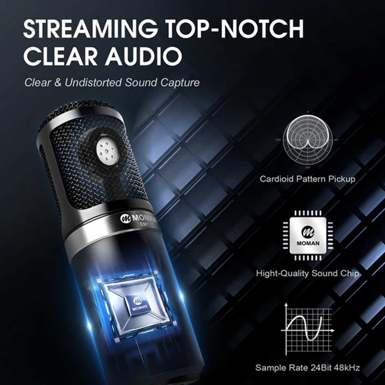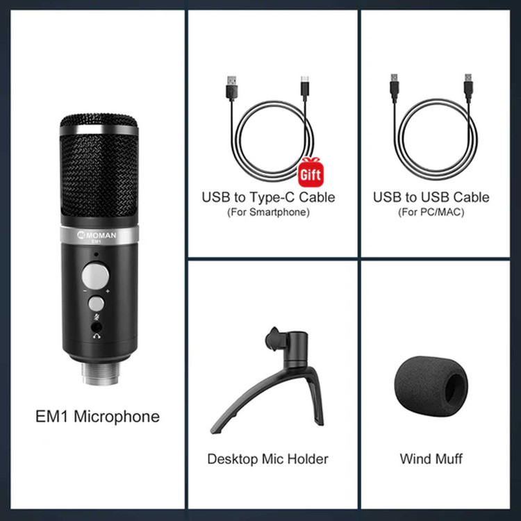 میکروفون استودیویی مومان مدل EM1 یک میکروفون کاندنسر با الگوی قطبی Cardioid هست که با سیم و طریق Type-C و پورت USB به دستگاههای مختلف وصل میشه. این میکروفون دارای درگاه USB برای اتصال به دستگاههای مختلف با فرکانس پاسخگویی 20 هرتز تا 20 کیلوهرتز و امپدانس حدود 2.2 کیلو اهم با حساسیت 45±3 دسیبل بوده و برای عملکرد خودش به منبع تغذیه خارجی نیاز نداره.