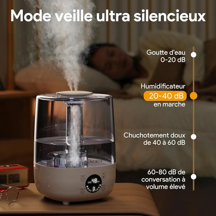 عملکرد بی صدا: رطوبت ساز اولتراسونیک تنها کمتر از 30 دسی بل صدای فوق العاده آرام در حین کار تولید می کند، بنابراین می توانید آن را در اتاق خواب یا حتی روی میز کنار تخت قرار دهید تا از خوابی آرام لذت ببرید. و اگر نمی خواهید تمام شب کار کند، رطوبت ساز از تنظیم تایمر توقف 1/2/4/8 ساعت پشتیبانی می کند.