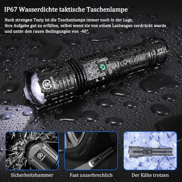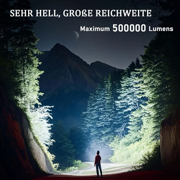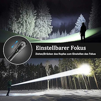 چراغ قوه فوقالعاده روشن: این چراغ قوه LED دارای خروجی نوری بالا به میزان ۵,۰۰۰ لومن است. هنگامی که در شب چراغ قوه را روشن میکنید، انگار که اشعههای خورشید را در دستان خود دارید. اگر از حالت نقطهای چراغ قوه در حالت شدت بالا استفاده کنید، میتواند تابلوهای خیابان را از فاصلهای تا ۱۸۰۰ متر روشن کند و اگر از حالت پخش نور استفاده کنید، میتواند ناحیهای تا ۲۸۰ متر مربع در اطراف شما را روشن نماید.