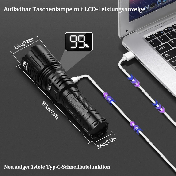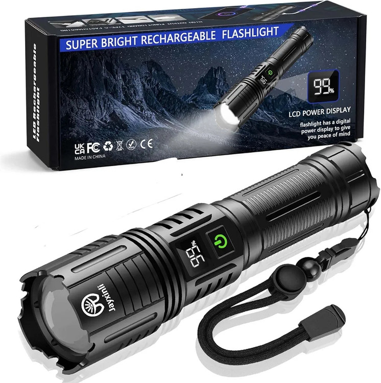 نمایشگر عملکرد LCD: ما نمایشگر قدرت LCD این چراغ قوه قابل شارژ را بهبود دادهایم تا وضعیت شارژ و تخلیه چراغ قوه را با دقت و راحتی بیشتری مشاهده کنید. فکر میکنم هر کاربر چراغ قوه به این عملکرد نیاز دارد.