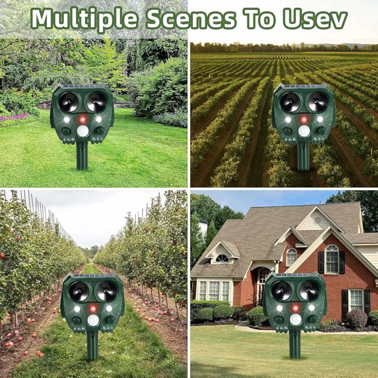 🦝【استفاده آسان】میله نگهدارنده را جمع کنید، سوراخی روی زمین حفر کنید تا دافع را وارد کنید. فرکانس را به درستی تنظیم کنید. زاویه حس رانندگی حیوان 110 درجه است و فاصله موثر بسته به جثه حیوان 30 فوت است. هنگامی که حیوانات وحشی وارد این محدوده می شوند، دافع حیوانات نورهای اولتراسونیک و فلاش را برای دور کردن آنها می فرستد.