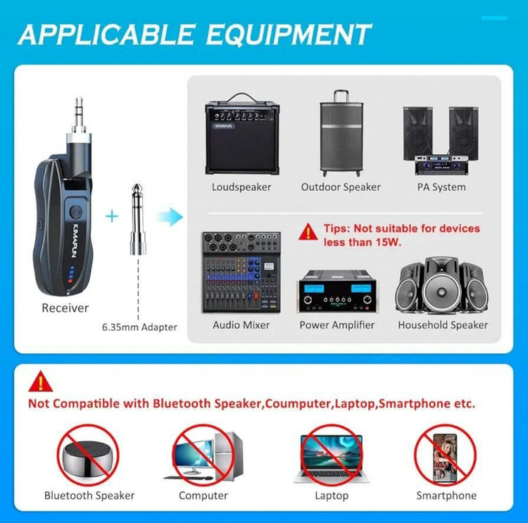 تجهیزات کاربردی: این سیستم فقط برای بلندگوهای عمومی، میکسرها، تقویت کننده های برق، دوربین ها و سایر تجهیزات با ورودی صدا/میکروفون 3.5mm/6.35mm (1/8 اینچ یا 1/4 اینچ) مناسب است. این محصول با تلفن های همراه، رایانه یا بلندگوهای کوچک فقط با عملکرد بلوتوث سازگار نیست.