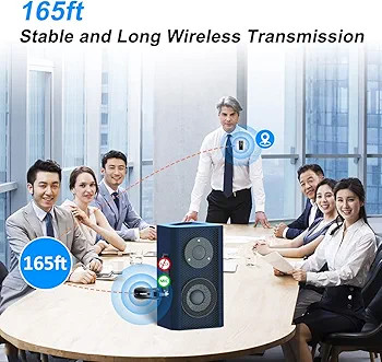 【Plug and Play】 کلید پاور را فشار دهید تا به صورت خودکار مطابقت داشته باشد و گیرنده را برای استفاده به بلندگو متصل کنید. نیازی به بلوتوث نیست. میکروفون تعبیه شده در فرستنده می تواند صدای پیکاپ را هدایت کند، همچنین می تواند به یک میکروفون یقه ای خارجی 3.5 میلی متری متصل شود.