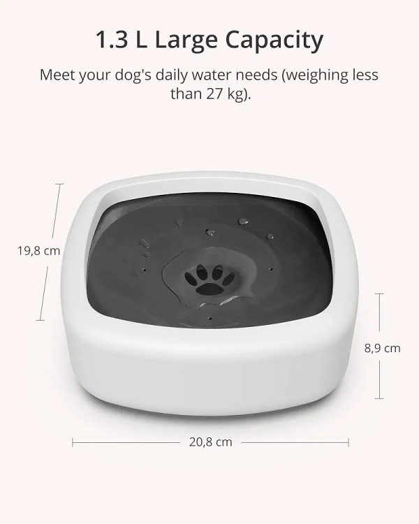 ظرفیت بزرگ: با ابعاد 19.7 x 20.8 x 9 سانتیمتر، این کاسه قطرهای سگ بدون نشت ظرفیت 1.3 لیتری دارد که برای سگهای زیر 27 کیلوگرم برای نوشیدن یک روز کامل کافی است.