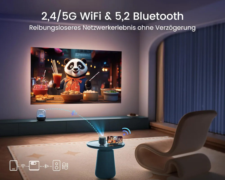 پروژکتور 5G وای فای و بلوتوث: پروژکتور کوچک از وای فای دو فرکانس 2.4G + 5G استفاده می کند، چند ثانیه به صورت بی سیم همگام می شوند تا از طریق دستگاه iOS/Andorid/Windows 10 صفحه نمایش بزرگی به دست آورند. در حالت هات اسپات، همگام سازی صفحه حتی بدون Wi-Fi نیز امکان پذیر است. تلفن همراه پروژکتوری میتواند بلندگوی بلوتوث ایدهآل را در هر زمان وصل کند و تمام جلوههای صوتی جزئیات را ذخیره کند تا شما را وارد صحنههای صوتی مختلف کند.