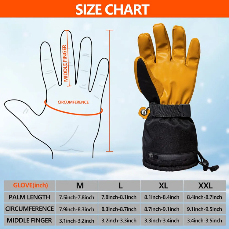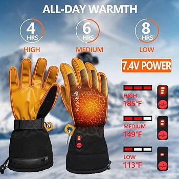دستکشهای گرمکن مردانه و زنانه را میتوان با 3 تنظیم دما شارژ کرد: دمای بالای نور قرمز (140-150 درجه فارنهایت) به مدت 2-4 ساعت، نور سفید با دمای متوسط (122-131 درجه فارنهایت) برای 3-5 ساعت، نور آبی دمای پایین (100-113 درجه فارنهایت) به مدت 6-8 ساعت. عملکرد گرمایش این دستکش های با باتری گرم می شود، نیازی به پیش گرم کردن ندارد و تنها در 3 ثانیه شما را گرم نگه می دارد.