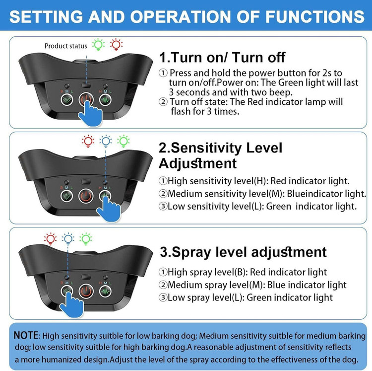 قلاده ضد پارس اسپری دار(جدیدترین تکنولوژی قلاده های ضد پارس)بدون شوک و ویبره دارای دکمه تنظیم سطح حساسیت نسبت به پارس و دکمه تنظیم سطح پاشش اسپری