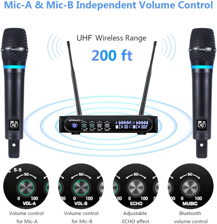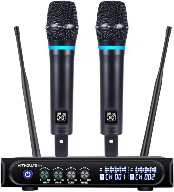 سیستم میکروفون بی سیم شارژی موجود در بازار با این قیمت، میکروفون بی سیم شارژی دوگانه UHF با سیستم گیرنده بلوتوث. ایده آل برای کارائوکه، سخنرانی، جلسه، مهمانی، هیئت، عروسی، دی جی، اجرا، داخل یا خارج از خانه. نیازی به تنظیم نیست، فقط وصل کنید و استفاده کنید