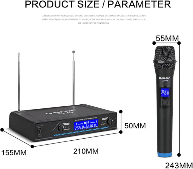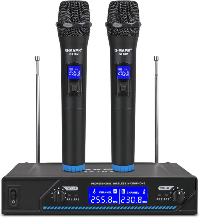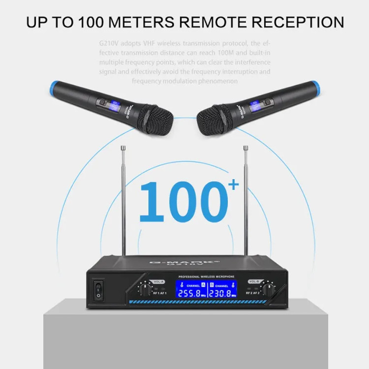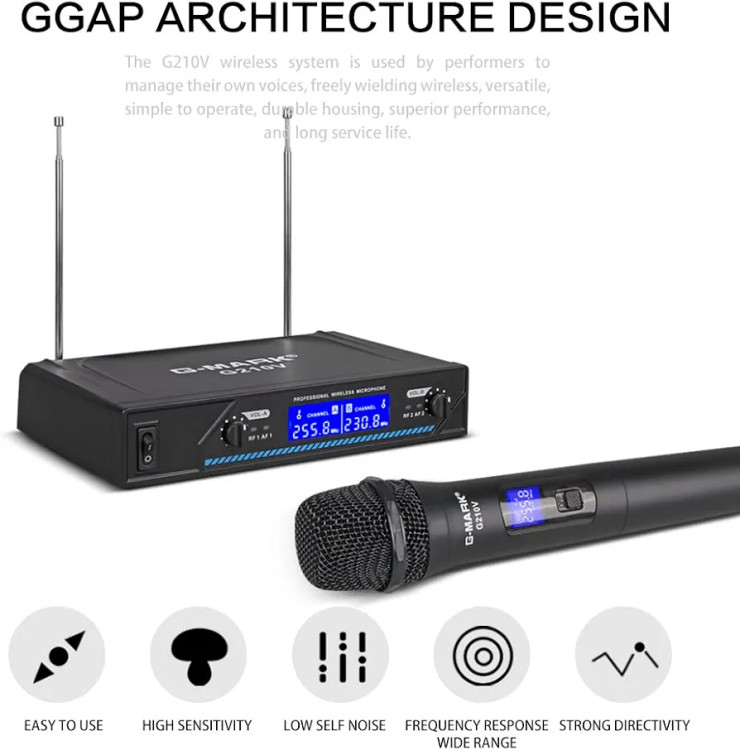 میکروفون وایرلس حرفه ای با دو میکروفون سیم بدون سیم VHF،برای آواز خوانی،روضه خوانی،عروسی ها و مراسمات با برد 200 فوت برند G-MARK مدل G210V