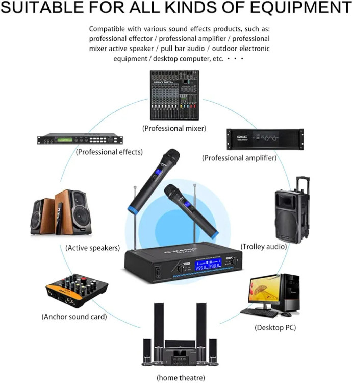 برد بی سیم: فاصله دریافت این سیستم میکروفون بی سیم حدود 30 تا 50 متر است که می توانید با آنها به مکان های زیادی مانند پارک، کلیسا، اتاق جلسه، مهمانی دی جی و غیره حرکت کنید.