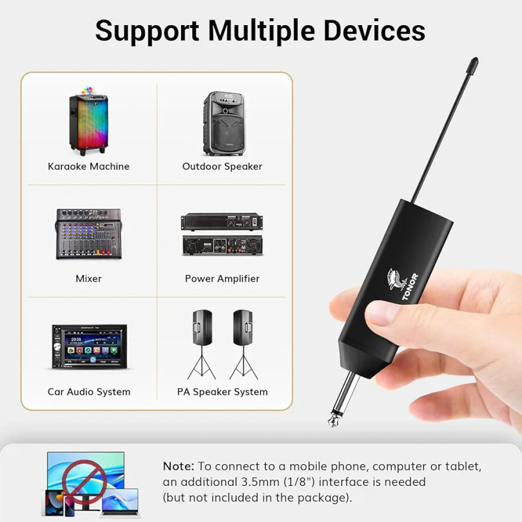 پشتیبانی از چند دستگاه: بسته بدنه و گیرنده ما به طور خودکار با روشن شدن جفت می شوند. گیرنده را به هر ورودی میکروفون 1/4 اینچی (0.255 اینچی) در سیستم صوتی خود مانند میکسرها، بلندگوها، دستگاه های کارائوکه و تقویت کننده های برق وصل کنید تا صدای صوتی خود را به صورت بی سیم منتقل کنید.