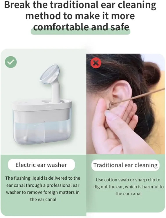 سیستم گوش پاک کن به گونه ای طراحی شده است که خود را با فوران های شدید آب تخلیه کند تا به راحتی جرم گوش را بدون نیاز به اتوسکوپ، دوربین داخل گوش یا موچین تخلیه کند.