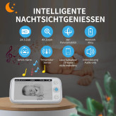 【دزدگیر صوتی و اینترکام】 – اگر کودک شما گریه کند یا دمای اتاق کودک شما از حدی که تعیین کرده اید بیشتر شود، بلافاصله یک صدای هشدار واضح دریافت خواهید کرد. 5 سطح برای تنظیم وجود دارد. وقتی فرزندتان برای شما گریه میکند یا فریاد میزند، میتوانید به لطف عملکرد اینترکام فوراً پاسخ دهید و او را آرام کنید. به لطف دید در شب پیشرفته و خودکار، می توانید کودک خود را حتی در اتاق های کاملا تاریک به وضوح ببینید.