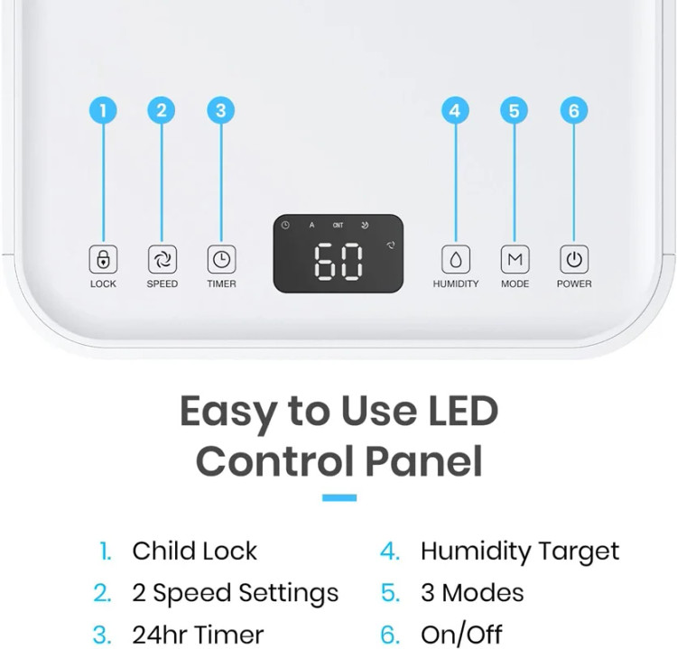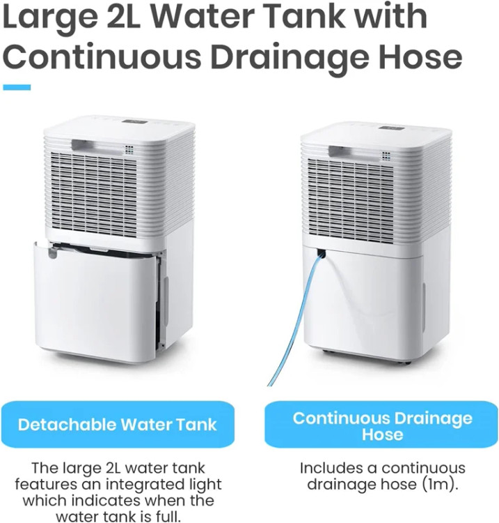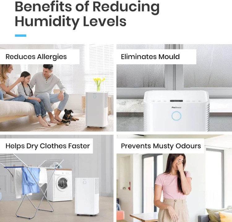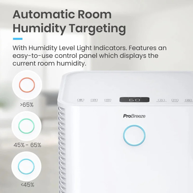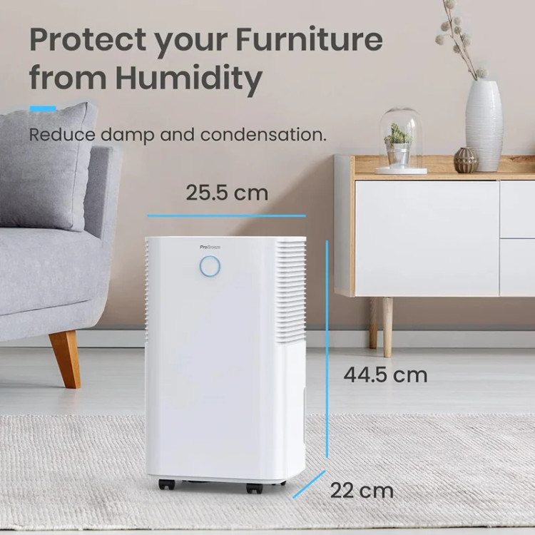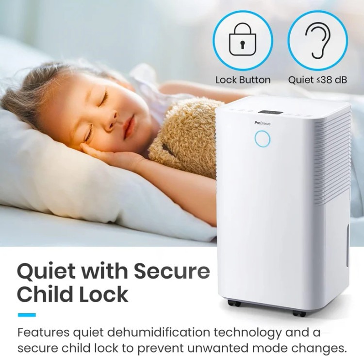 رطوبتگیر Pro Breeze با مصرف کم انرژی و کمپرسور قدرتمند، به طور موثری تا 12 لیتر رطوبت در روز حذف میکند. این دستگاه ایدهآل برای رفع رطوبت، کپک و تراکم در خانه و آشپزخانه است. با صدایی کمتر از 38 دسیبل، عملکرد بسیار بیصدایی دارد و مناسب فضاهای کوچک مانند کمد است.**ویژگیها:**- **سنسور رطوبت خودکار:** سطح رطوبت اتاق را اندازهگیری کرده و با رسیدن به میزان مطلوب بین 30-80٪، کمپرسور را برای صرفهجویی در انرژی خاموش میکند.- **صفحه نمایش LED و تایمر 24 ساعته:** امکان برنامهریزی برای روشن یا خاموش کردن دستگاه در هر زمانی از روز.- **مخزن آب 2 لیتری:** با امکان تخلیه مداوم، بدون نیاز به تخلیه مکرر مخزن. - **طراحی جمعوجور و قابل حمل:** با چرخهای تعبیهشده بهراحتی جابهجا میشود.