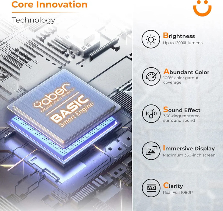 موتور هوشمند پایه: موتور هوشمند بیسیک یک فناوری طرح ریزی خلاقانه است که توسط YABER توسعه یافته است. پروژکتور Pro V7 4k اولین پروژکتور مجهز به این فناوری در صنعت پروژکتورهای سرگرمی خانگی با عملکرد پیشرو و کاربردی در صنعت است. از طریق این فناوری می توانید بهترین تجربه صوتی و تصویری را در پنج جنبه به دست آورید: روشنایی، رنگ فراوان، جلوه صوتی، نمایشگر همه جانبه، شفافیت. ویدئو پروژکتور Pro V7 بهترین تجربه بازی و فیلم را در اختیار شما قرار می دهد.